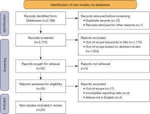 The selection process for this scoping review is demonstrated in Figure 1. A total of 2,786 articles were identified using the above search strategy, with 25 studies included after applying the eligibility criteria. The included studies gave a total sample size of 19,919 patients. Sixteen and eight studies were classified as retrospective and prospective respectively, with one study involving participants that were recruited both prospectively and retrospectively. Characteristics of the 25 eligible studies are summarised in Table 1.
