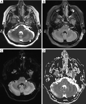 Post-operative cerebral angiography demonstrated successful complete obliteration of the AVM (Figure 3). Diffusion-weight imaging sequence revealed a small acute infarct of the left middle cerebellar peduncle likely related to endovascular embolization (Figure 4). On 3-month follow-up, she had persistent left sided sensorineural hearing loss but an improving House-Brackmann 3 palsy. She was reviewed by speech pathology both as an inpatient and outpatient given her hearing loss.